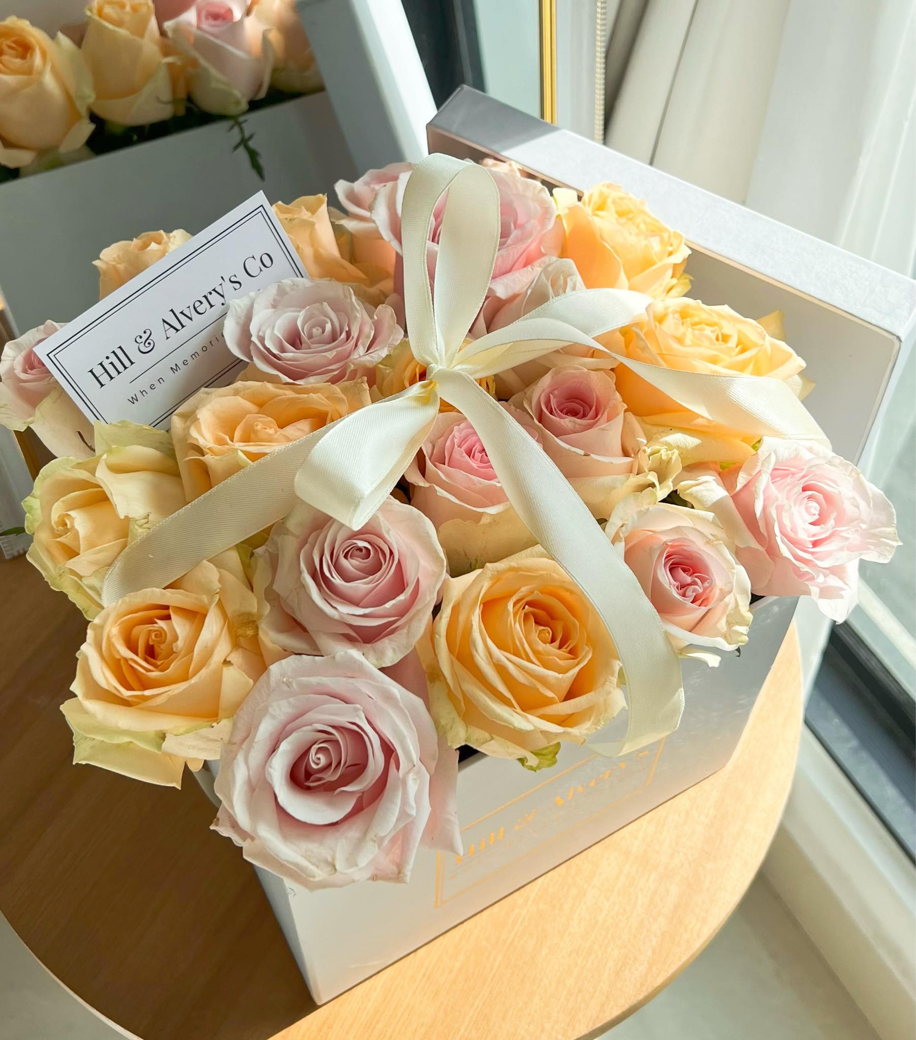 White Box Size - (20x20x15cmh). Contains 10-15 mixture of pink and champagne roses (or a mixture of up to 2 colours, kindly enquire for colour choices) Create your own bundle of happiness. The perfect blend of luxury and romance, these signature roses make a statement of refined taste and thoughtful sentiment.
