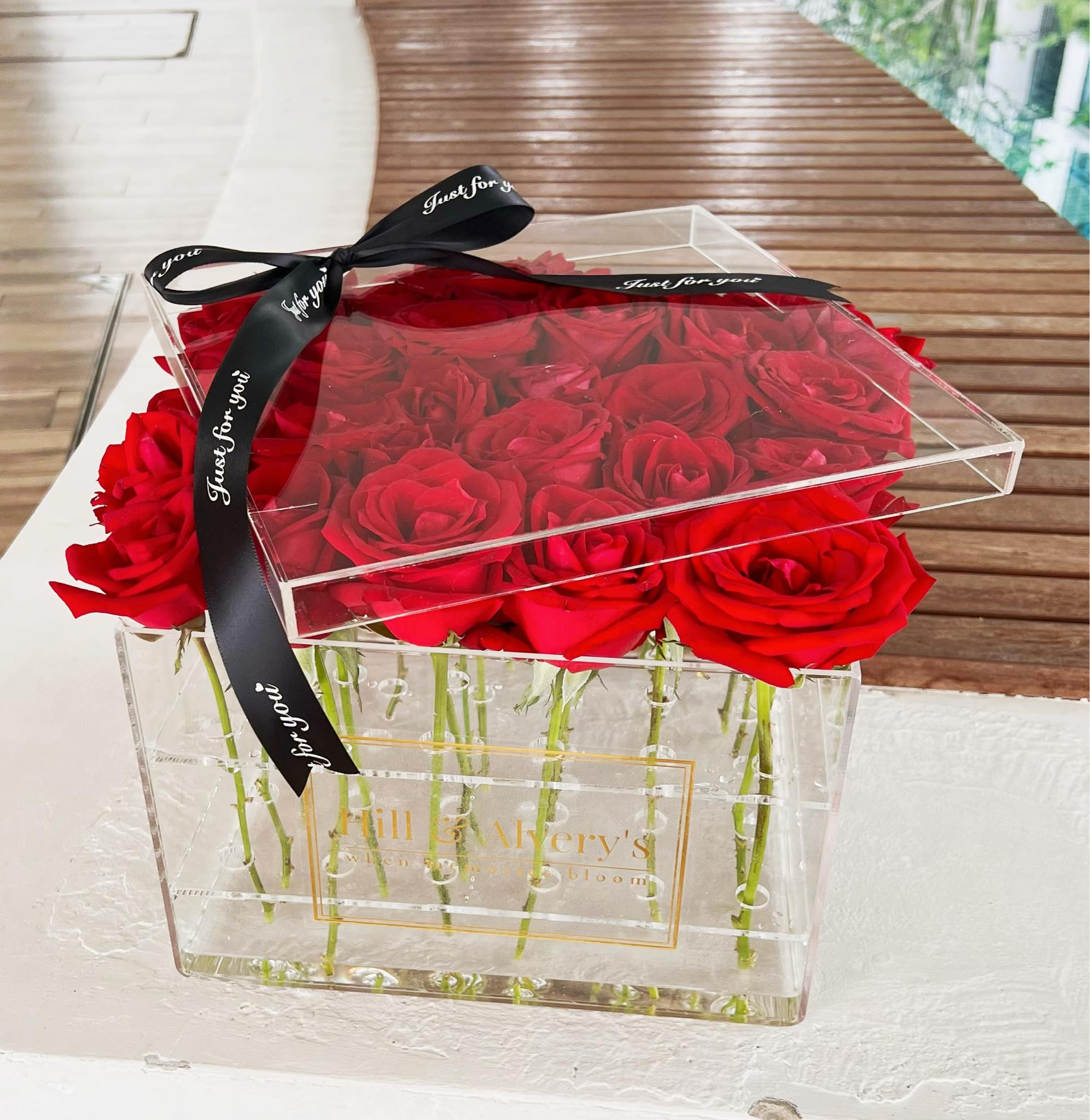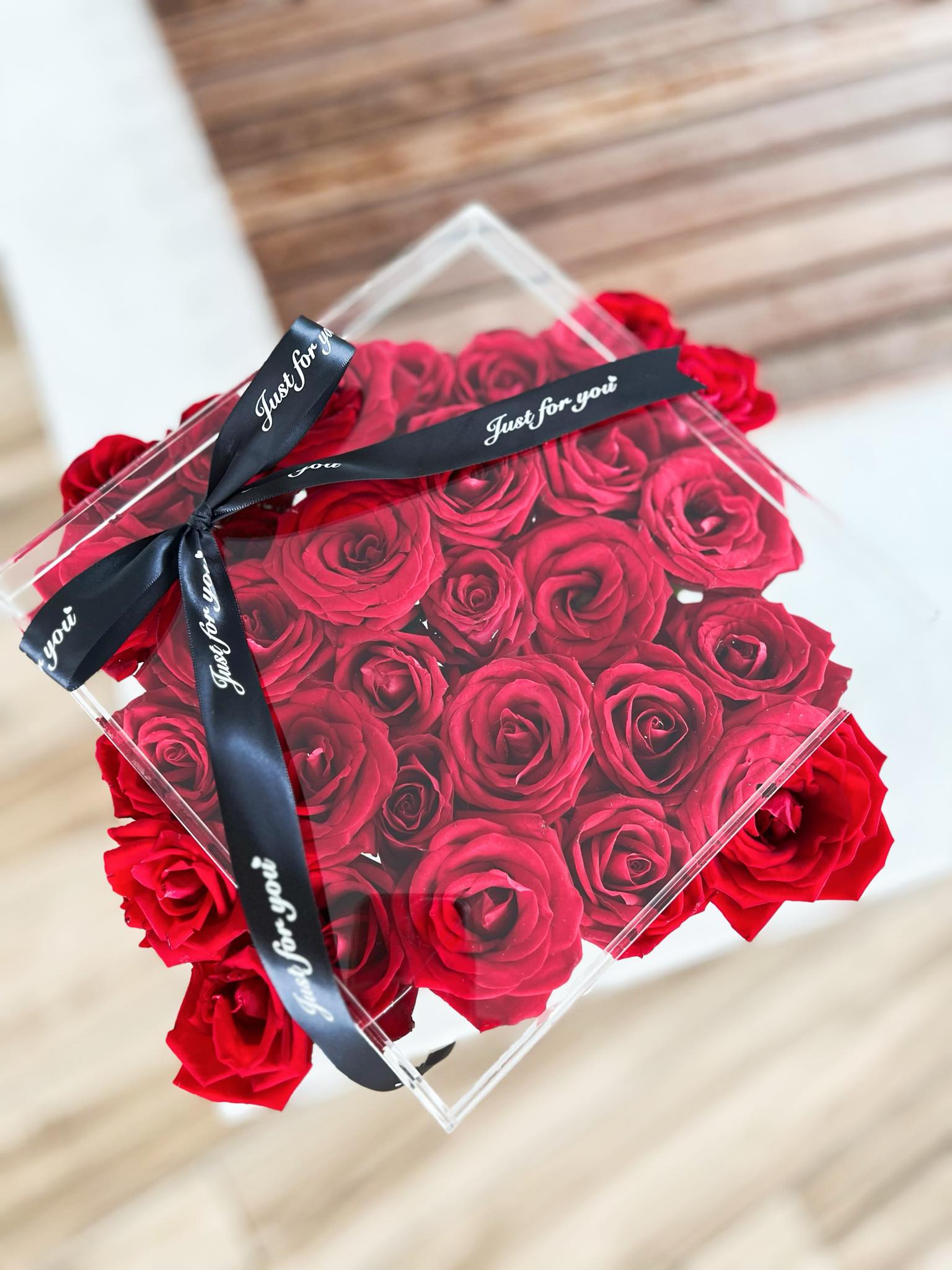 Acrylic Box Size - (25.5x25.5x17cmh) Contains 25-35 red roses (or any number of roses you require). Indulge in the pure allure of our exclusive designs. This enchanting floral arrangement combines the timeless beauty of delicate roses presented in an elegant acrylic box, creating a stunning visual masterpiece. This timeless acrylic boxed rose is a symbol of elegance and affection.