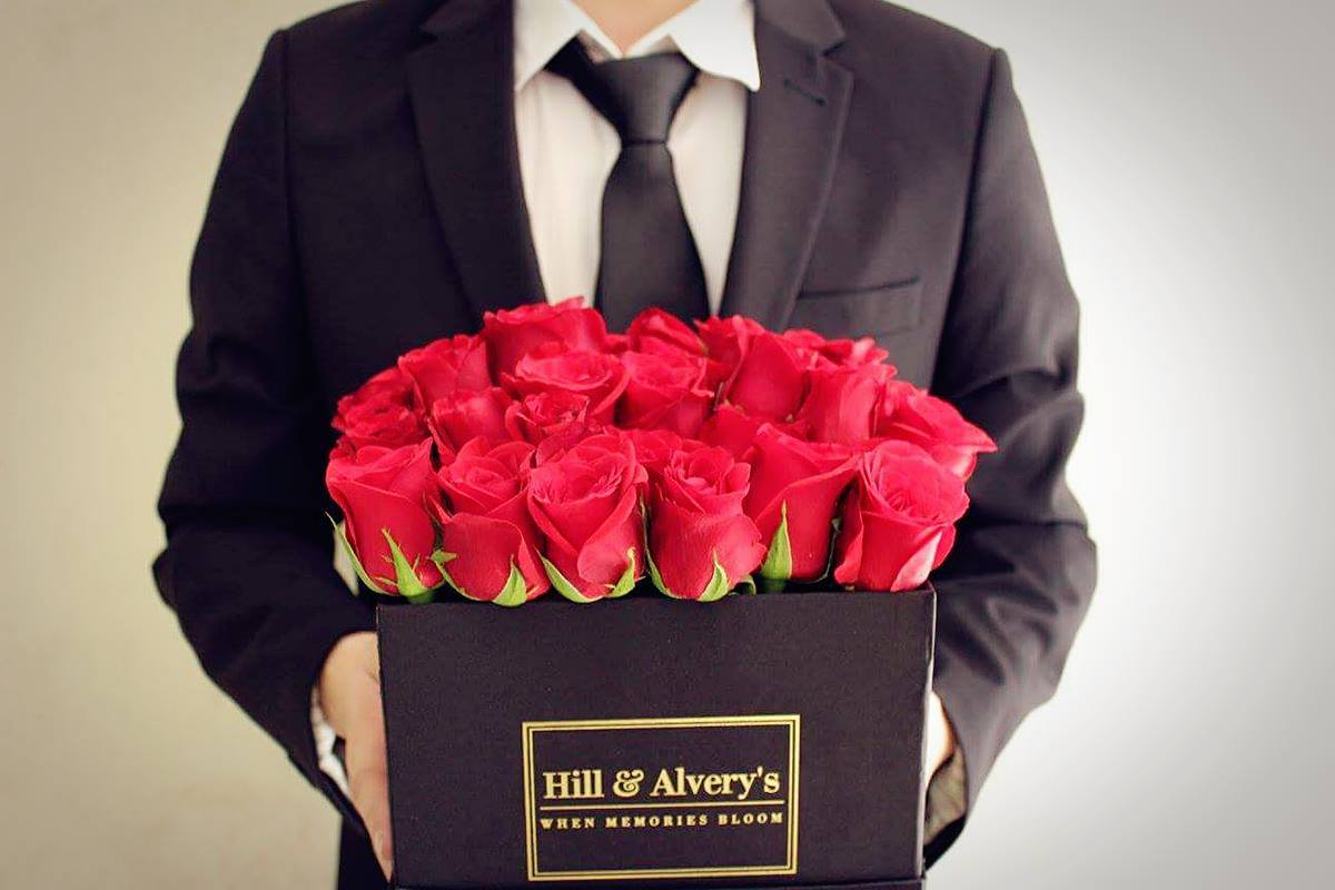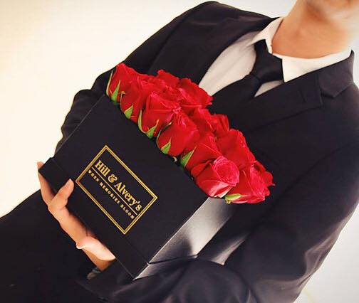Satin Box Size - (25.5x25.5x17cmh) Contains 15-20 red roses. Experience the epitome of elegance with our Signature Satin Black Box Roses. Carefully curated and beautifully presented, this exquisite floral arrangement features a selection of timeless roses nestled in a sophisticated satin black box. Ideal for date nights, valentines, birthday celebrations and even proposals or as a cherished gift for a loved one. Our Signature Satin Black Box Roses are a symbol of enduring beauty and distinctive style.
