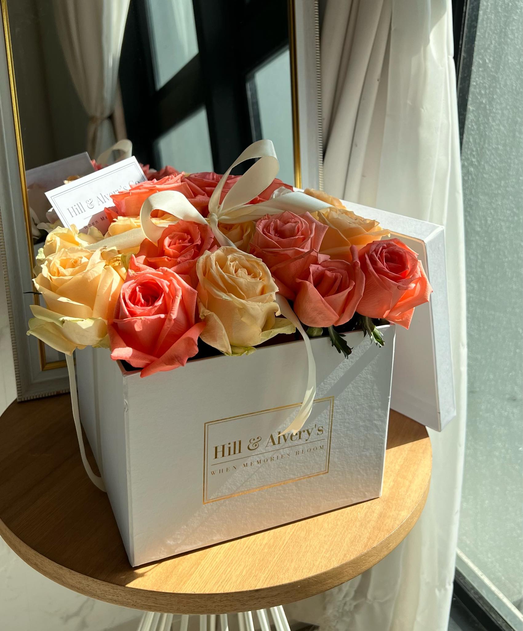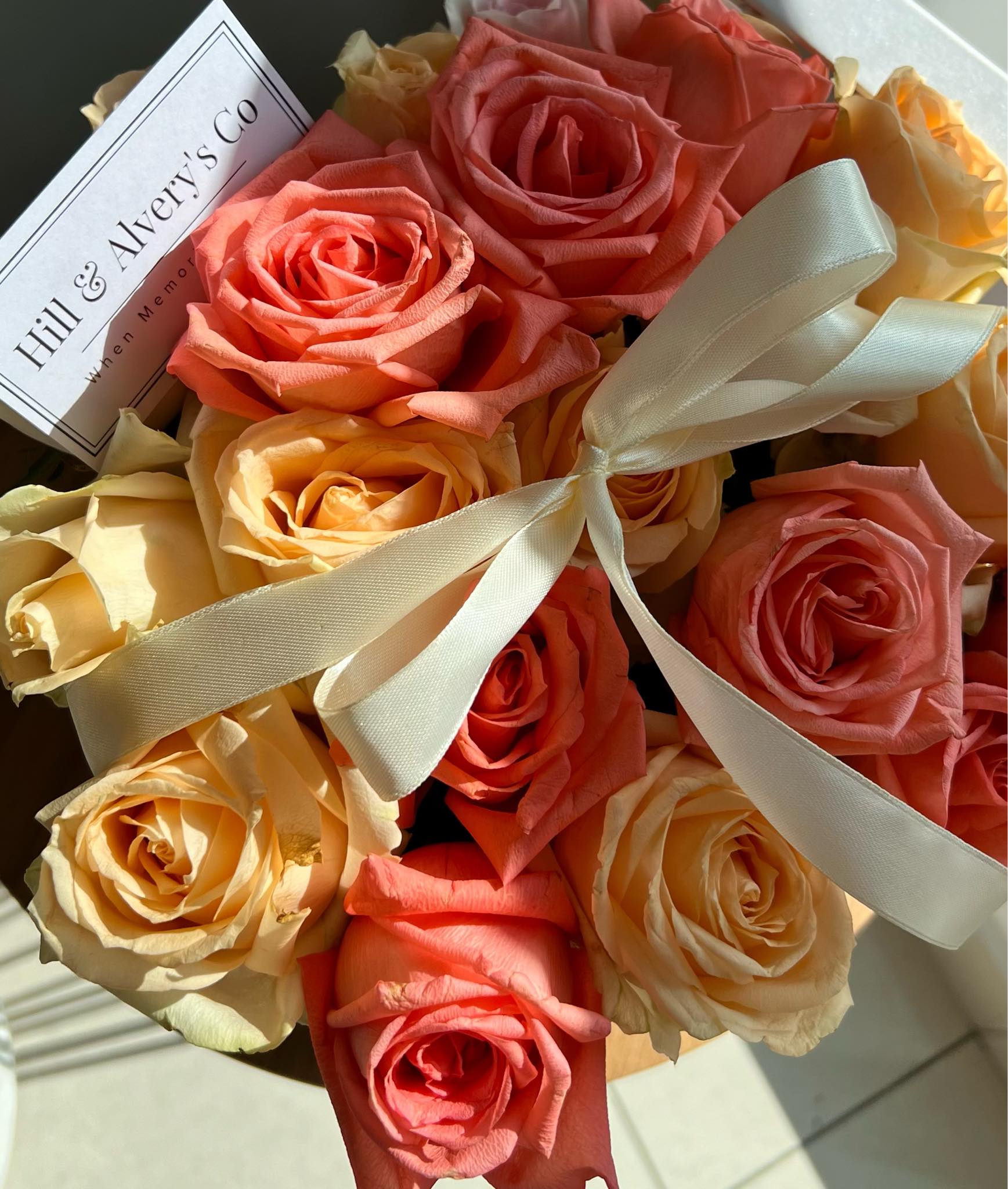 White Box Size - (20x20x15cmh) Contains 10-15 mixture of coral and champagne roses. “You are a delightful person; I can’t take my eyes off you.” This box is a symbol of energy and outgoing personality. The perfect blend of luxury and romance, these signature roses make a statement of refined taste and thoughtful sentiment.