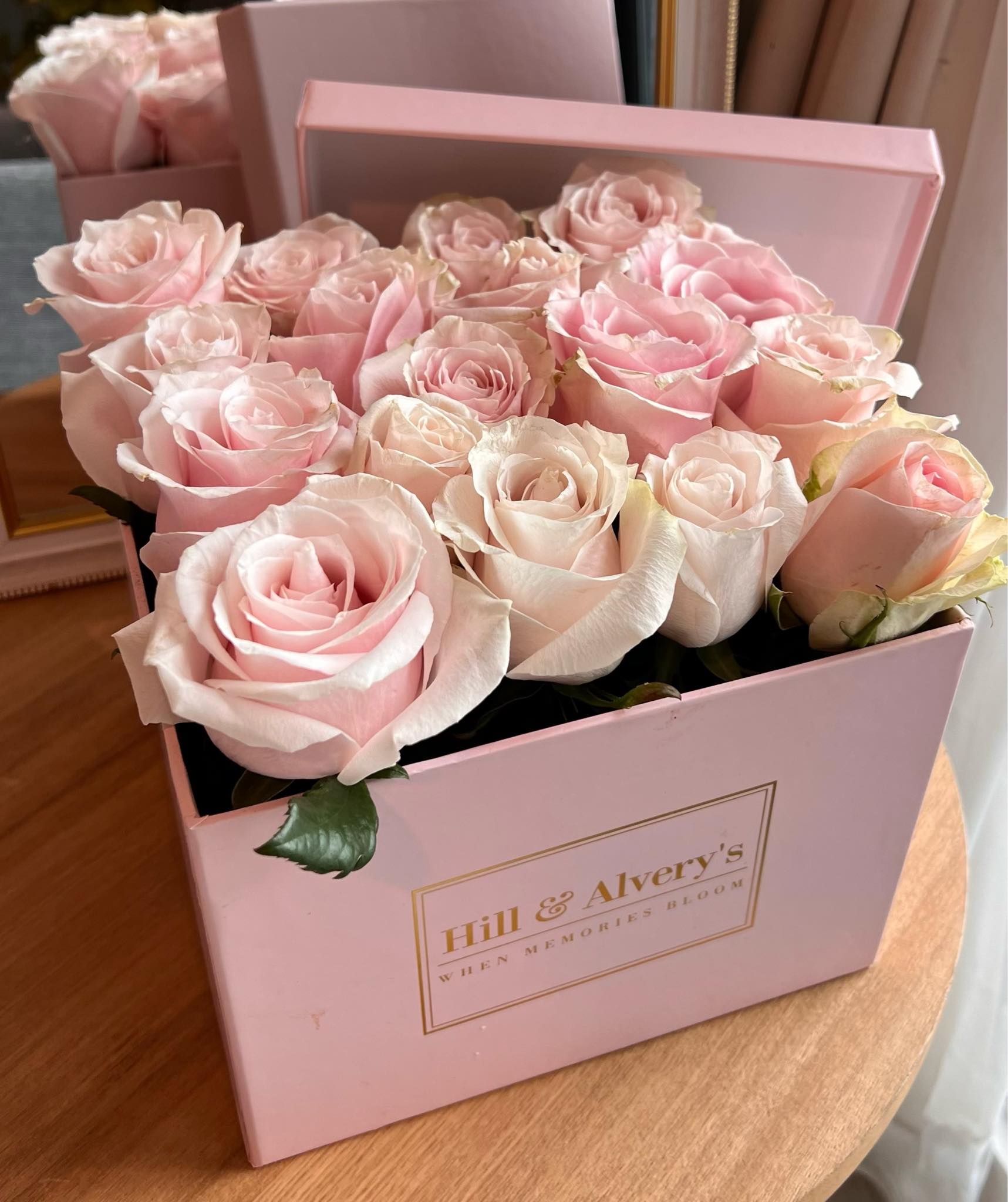 Pink Box Size - (20x20x15cmh) Contains 10-15 pink roses “She is the life of the party and impresses everyone she meets.” This box is a symbol of dazzling personality. The perfect blend of luxury and romance, these signature roses make a statement of refined taste and thoughtful sentiment.