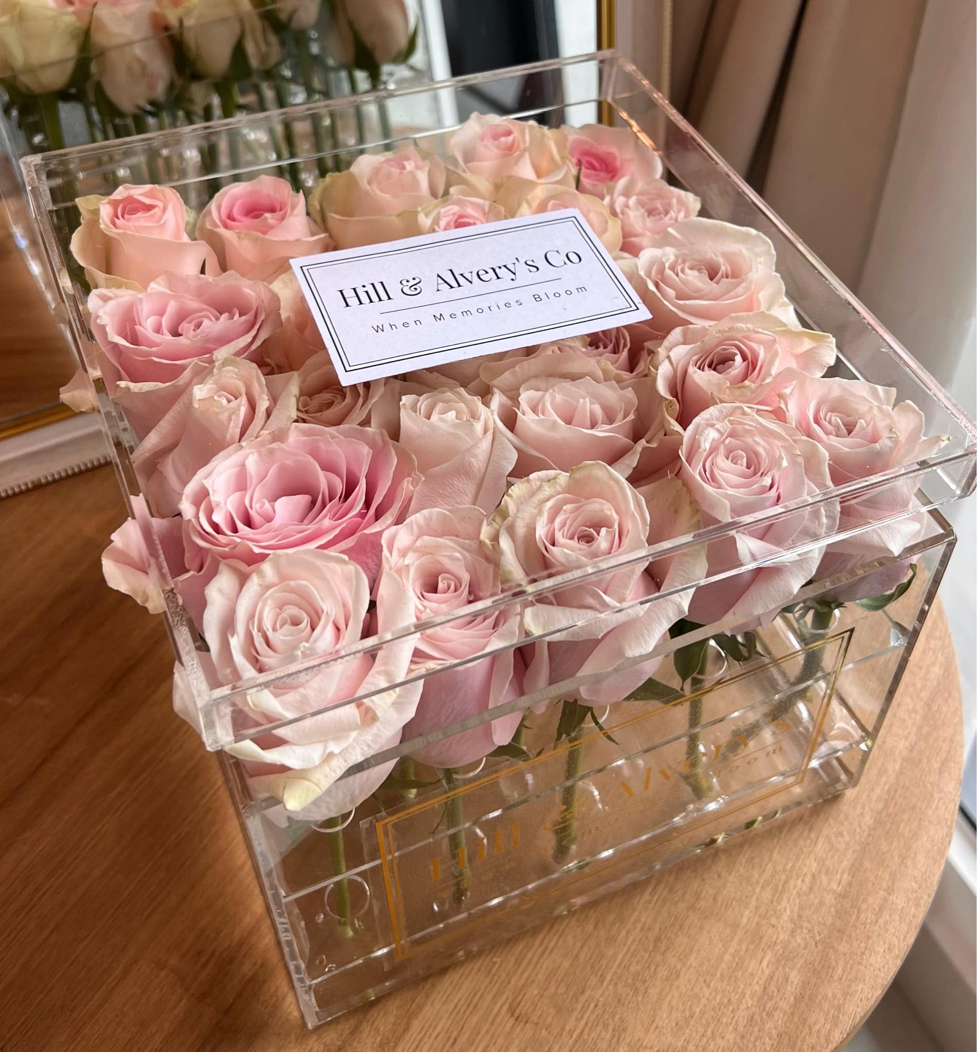 Acrylic Box Size - (20x20x15cmh) Contains 15-25 pink roses. Indulge in the pure allure of our latest designs. This enchanting floral arrangement combines the timeless beauty of delicate roses presented in an elegant acrylic box, creating a stunning visual masterpiece. “She draws people to her as if they are pulled by a magnetic force.” This timeless acrylic boxed rose is a symbol of gentle and magnetic personality.