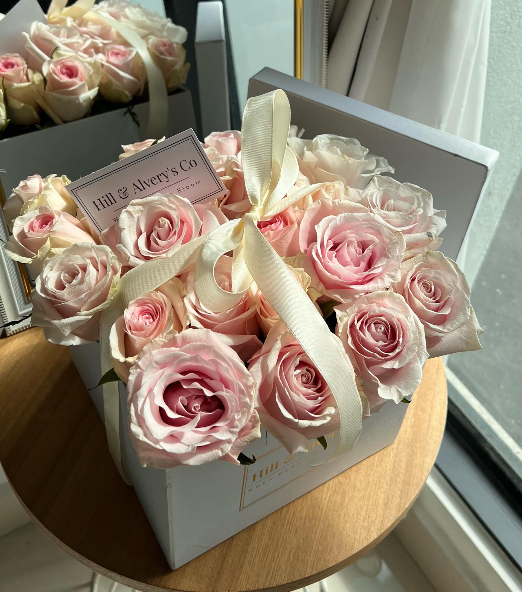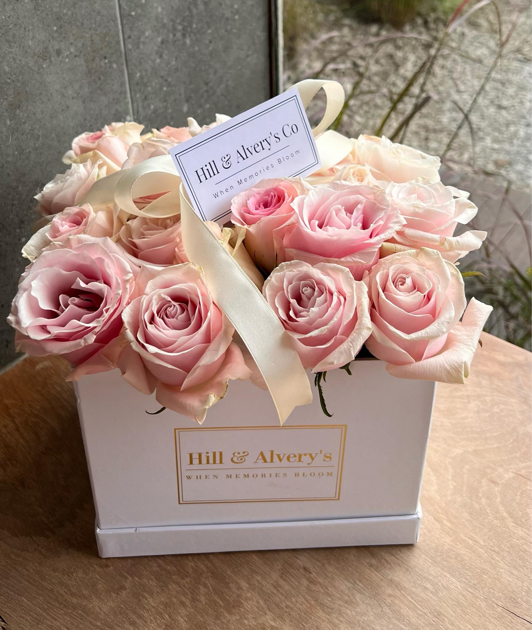 White Box Size - (20x20x15cmh) Contains 10-15 pink roses. “Heart as pure as gold”. This box is a symbol of purity and modest personality. The perfect blend of luxury and romance, these signature roses make a statement of refined taste and thoughtful sentiment.